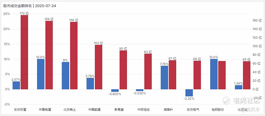 1、成交额前三:$东方财富(300059)$、$中国电建(601669)$、$北方稀土(600111)$