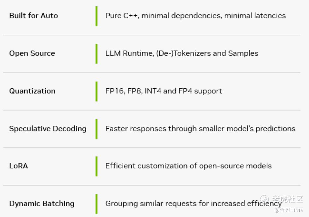 对于英伟达来说,通过软硬件结合的方式来持续推进并引领最新的技术进展,一直是其面向汽车行业进行技术赋能的核心逻辑——由此,面对大语言模型快速上车的大趋势,DRIVE 平台更好地支持 LLM 的部署,成为这一逻辑落地的关键一环。
