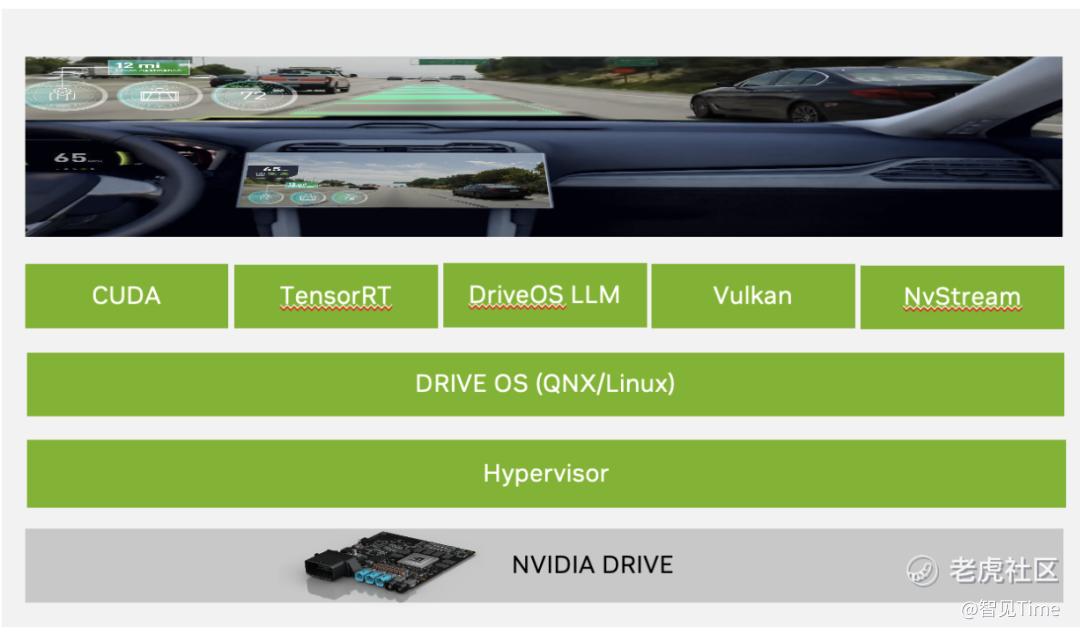 DriveOS 是英伟达提供的软件板级支持包,包括英伟达自研的Type-1 虚拟机,虚拟机之上不同的操作系统(Linux或者QNX),操作系统上的丰富的SDK。这些SDK包括大家熟悉的CUDA,TensorRT,Vulkan,还有特意为支持大语言模型的软件开发包DriveOS LLM SDK。这些SDK可以使开发者更容易的访问 SoC 中的各种硬件加速引擎,快速的部署应用在英伟达的平台。