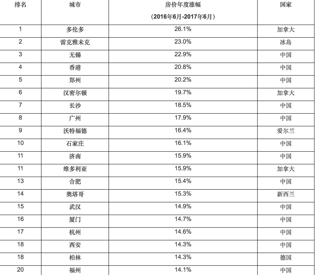 根据胡润研究院发布《2017上半年胡润全球房价指数》显示,杭州的房价年度涨幅14.6%,排名全球第17名。