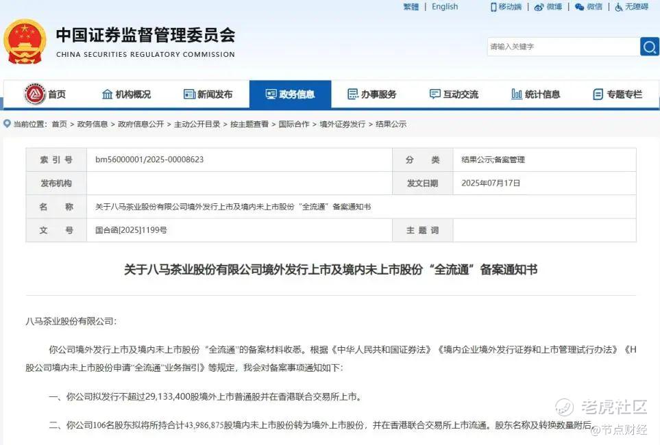 近日,中国证监会官网一则《关于八马茶业股份有限公司境外发行上市及境内未上市股份全流通备案通知书》的发布,标志着八马茶业的赴港上市备案程序正式完成。而根据港交所规则,这纸“备案通知书”是安排上市聆讯的最后一道前置条件。 八马茶业迈进港交所大门只有一步之遥。