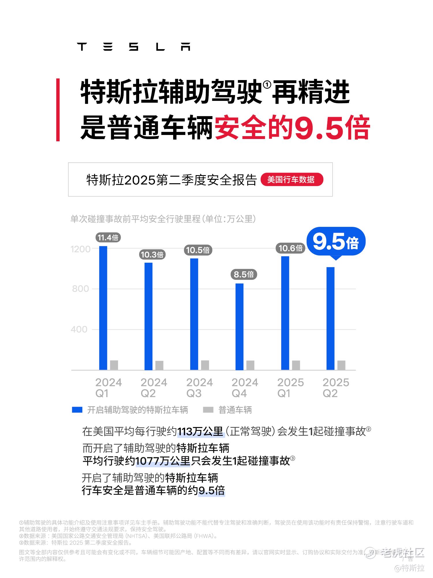 特斯拉2025第二季度安全报告显示,开启辅助驾驶功能的特斯拉车辆,安全性是普通车辆的9.5倍🦾