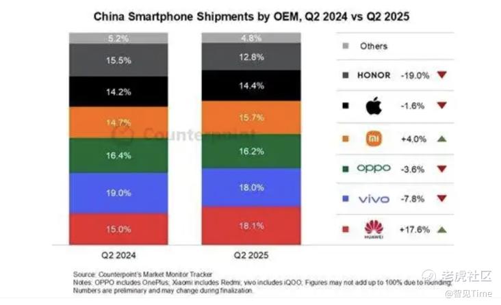 接着到 7 月份下旬,来自另一家调研机构 Counterpoint Research 的数据显示,在 2025 年第二季度的国内智能手机出货量市场排名中,前五名与 IDC 的排名一致,而荣耀以 12.8% 的份额位居第六名。