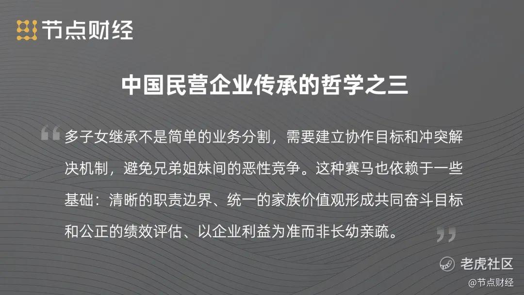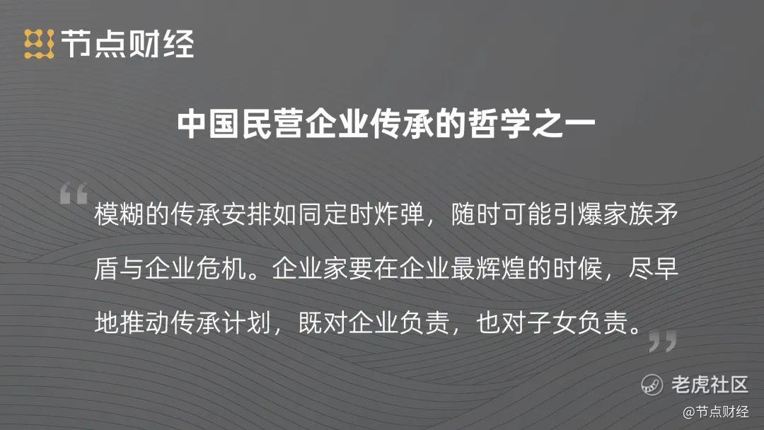 《节点财经》认为中国民营企业传承的哲学之一:模糊的传承安排如同定时炸弹,随时可能引爆家族矛盾与企业危机。企业家要在企业最辉煌的时候,尽早的推动传承计划,既对企业负责,也对子女负责。