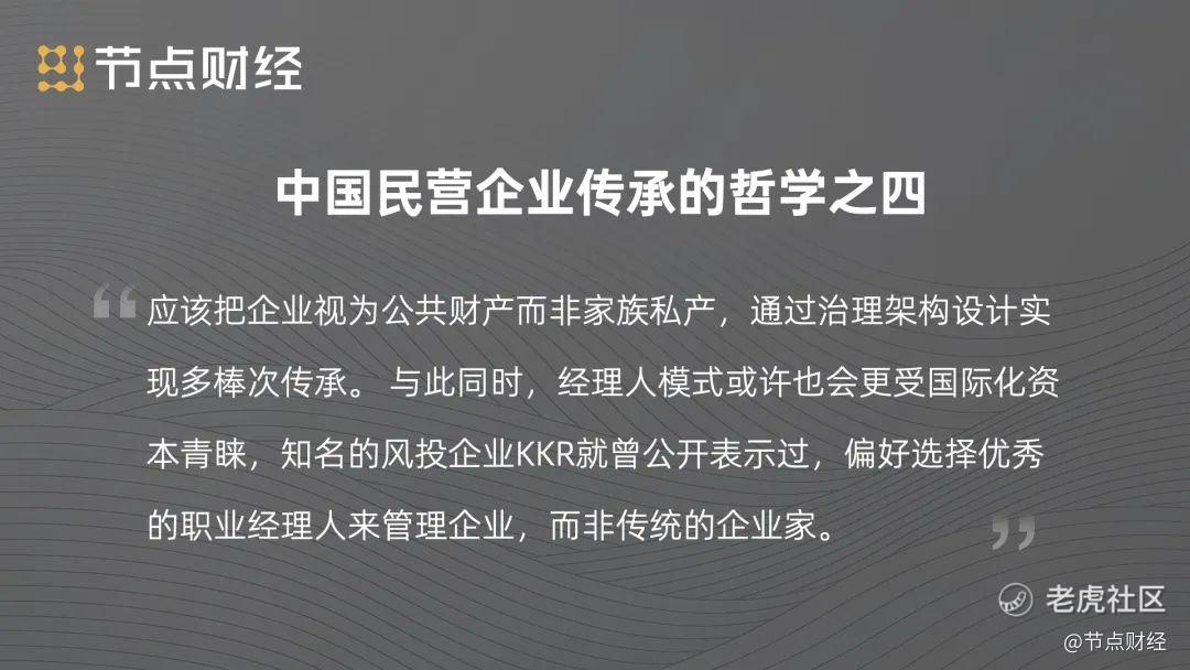 《节点财经》认为中国民营企业传承哲学之四:应该把企业视为公共财产而非家族私产,通过治理架构设计实现多棒次传承。 与此同时,经理人模式或许也会更受国际化资本青睐,知名的风投企业KKR就曾公开表示过,偏好选择优秀的职业经理人来管理企业,而非传统的企业家。