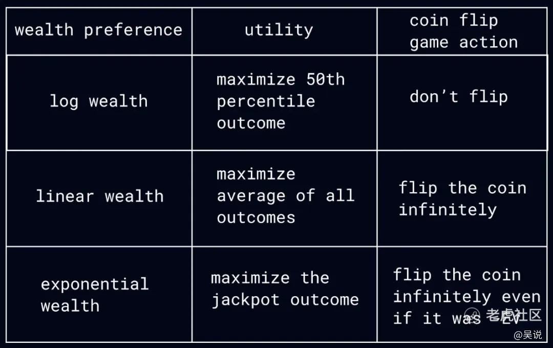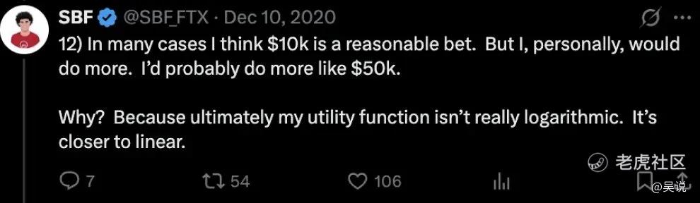 SBF 曾自豪地宣称自己秉持的是线性型财富偏好。由于他立志要把所有财富捐出去,他的逻辑是:从 100 亿美元增长到 200 亿美元,与从 0 增长到 100 亿美元同等重要。因此,从 “文明发展的角度” 来看,下注于巨额高风险的投资是完全合理的选择。三箭资本(Three Arrows Capital)的 Su Zhu 也表达了对线性型财富偏好的认同,甚至更进一步,提出了所谓的指数型财富偏好(exponential wealth preference)。