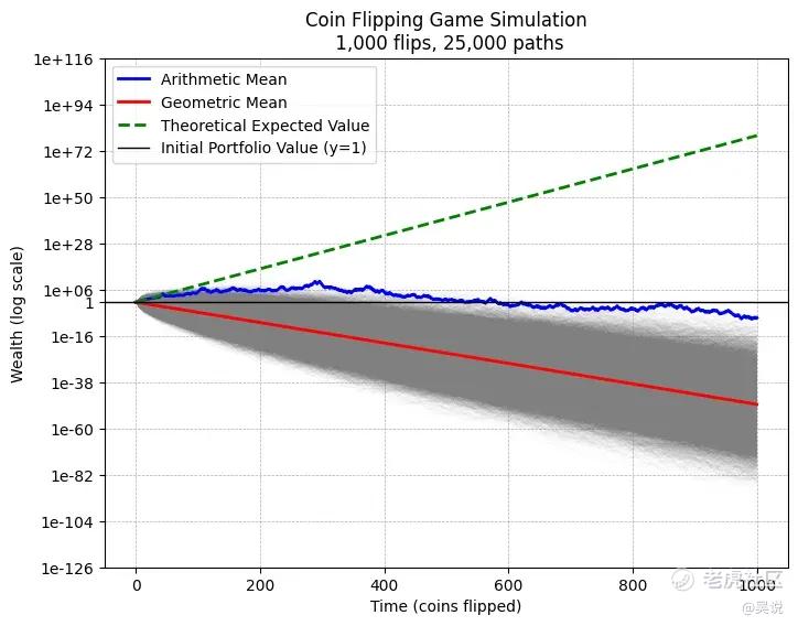 算术平均值衡量的是所有可能结果所创造的平均财富。在我们的抛硬币游戏中,财富分布极度偏向于少数 “中大奖” 的极端情况。相比之下,几何平均值衡量的是你在中位数情境中可能获得的财富水平。
