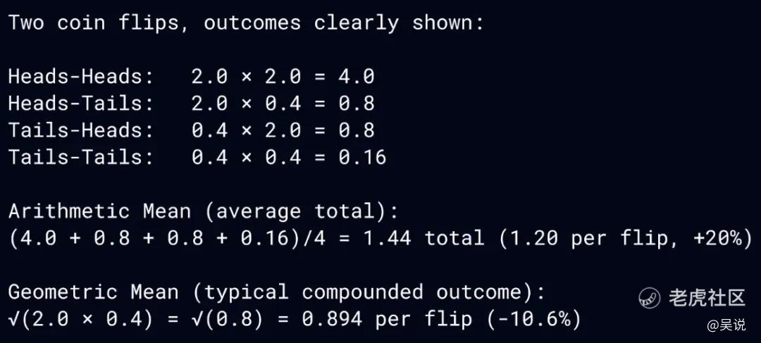 几乎所有人最终归零的原因在于这个重复抛硬币游戏具有 “乘数效应”(multiplicative property)。尽管该游戏的期望值(也就是算术平均值)是正的 — — 每次抛硬币的平均收益为 20%,但它的几何平均值却是负的,这意味着从长期来看,这个游戏实际上是在产生负复利效应。