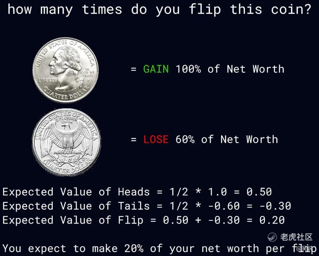 乍一看,这个游戏简直就像一台印钞机。每次抛硬币的期望收益是你净资产的 20%,因此你应该无限次地进行这个游戏,最终便能积累全世界的财富。