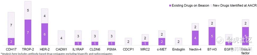 2025 年AACR大会上共披露250多种ADC药物。其中,Beacon ADC数据库显示,新增110余种ADC药物,与2024年的34种相比,增幅达223%。本届大会共披露163个靶点,下图展示了新药研发中分子数目排名前十五的靶点分布,其中TROP-2、HER-2和CDH17位列前三。