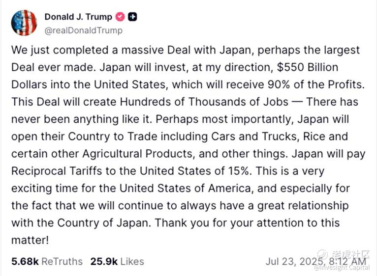 与日本的贸易协议中规定,美国将对包括汽车在内的日本商品统一征收15%关税,同样低于此前特朗普信函中威胁的25%税率,作为代价,日本承诺将向美国投资5500亿美元,投资方将由美国主导,用于重建和扩大美国核心工业,包括基础设施、半导体制造、矿业加工、医药生产等;此外,日本将立即增加75%的免税美国大米进口配额,并购买价值80亿美元的美国农产品,美国汽车标准首次得到日本认可,将能够进入日本消费市场,同时承诺购买100架波音等美国制造的民用飞机。