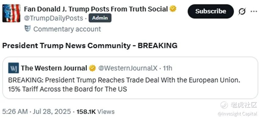 周日,特朗普在欧洲与欧盟委员会主席冯德莱恩会面,最终在其宣称的8月1日的“关税大限”前,与欧盟达成了重磅贸易协议。上周,美国与日本也敲定了最终贸易协议,至此,美国 $纳斯达克100指数(NDX)$ 与除中国 $纳斯达克中国金龙指数(HXC)$ 外的重要经济体基本达成了贸易协议,特朗普主导的关税博弈似乎暂告一段落,然而,随之而来的风险依然不容小觑。