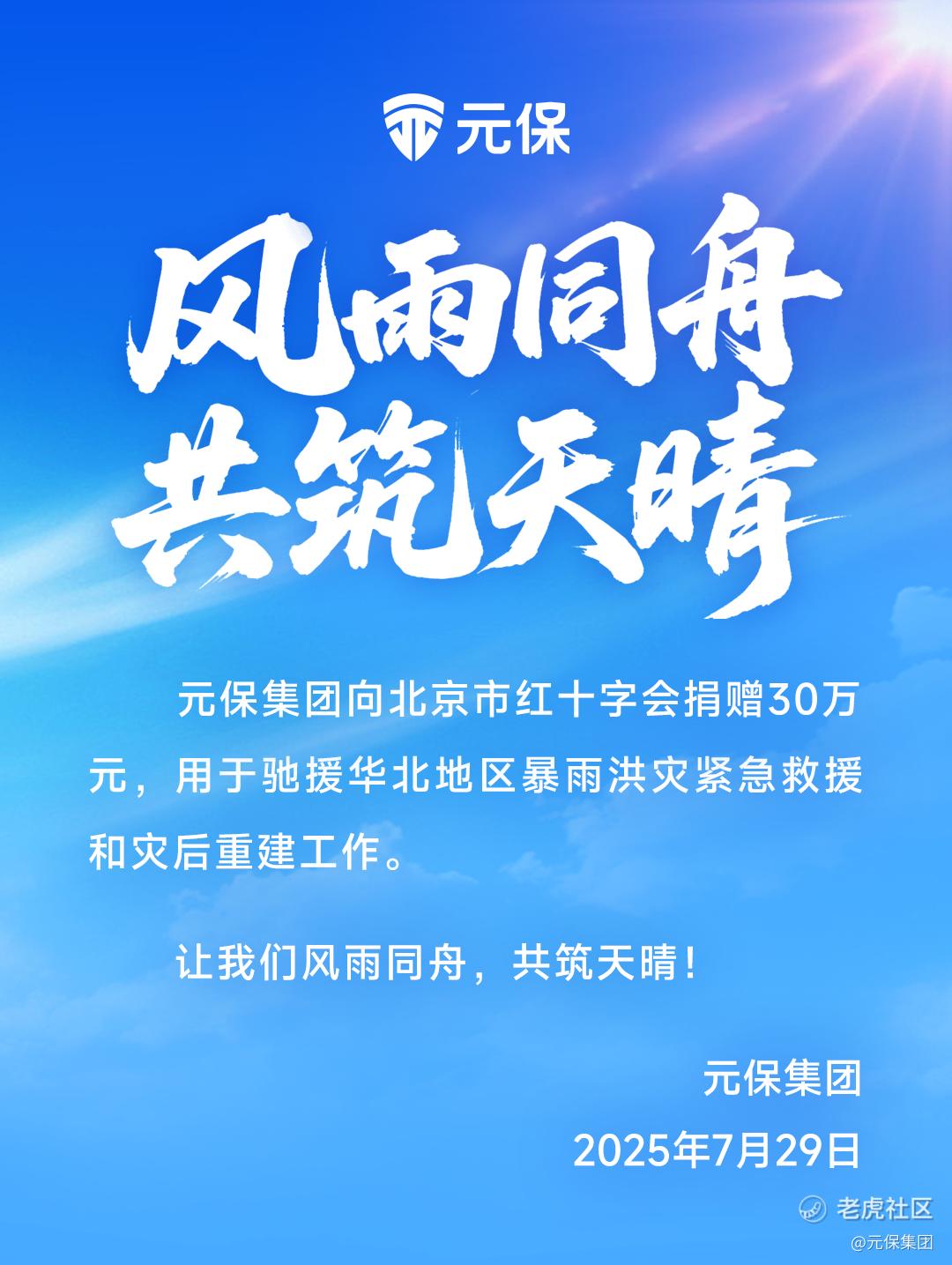 近日,极端降雨持续侵袭北京、河北等地区,引发严重洪涝灾害。元保密切关注本次灾害风险,向北京市红十字会捐款30万元用于灾区援助。