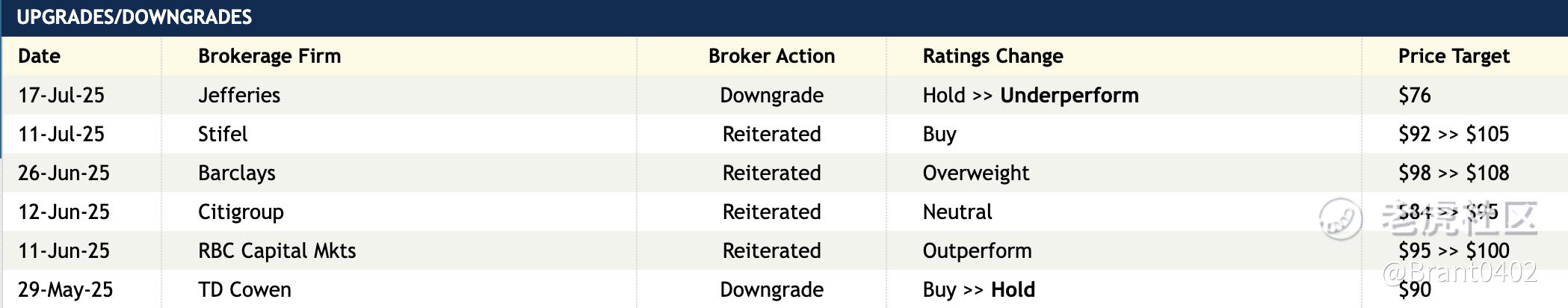 虽然Jefferies刚刚在7月17日下调评级至“跑输大盘”,但包括Stifel、Barclays、RBC在内的多家机构仍维持“买入”或“增持”评级,并上调目标价至100美元以上。