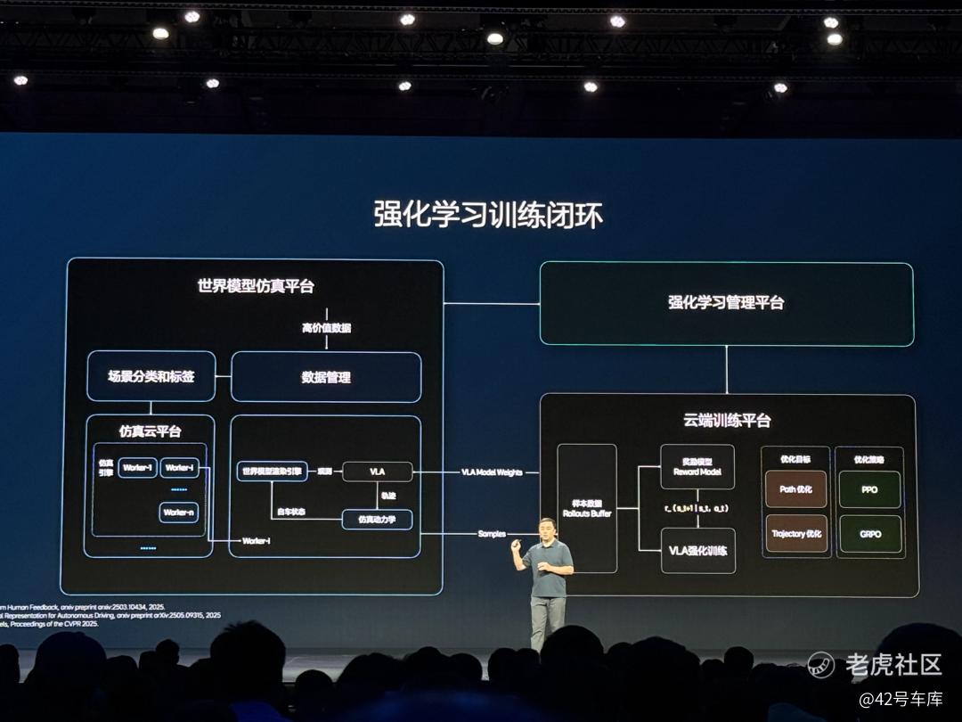 支撑这套体系的是理想在推理与训练算力上的资源投入。郎咸朋介绍,当前理想拥有总计 13 EFLOPS 的训练平台,其中 10 EFLOPS 分配给训练,3 EFLOPS 用于推理。推理能力的重要性在 VLA 时代被放大,因为世界模型的生成与场景扩展都依赖推理性能,若没有强大的推理卡,就无法开展真正有效的强化训练。据理想内部估算,其目前所拥有的推理资源等效于 3 万张英伟达 L20 的推理卡。