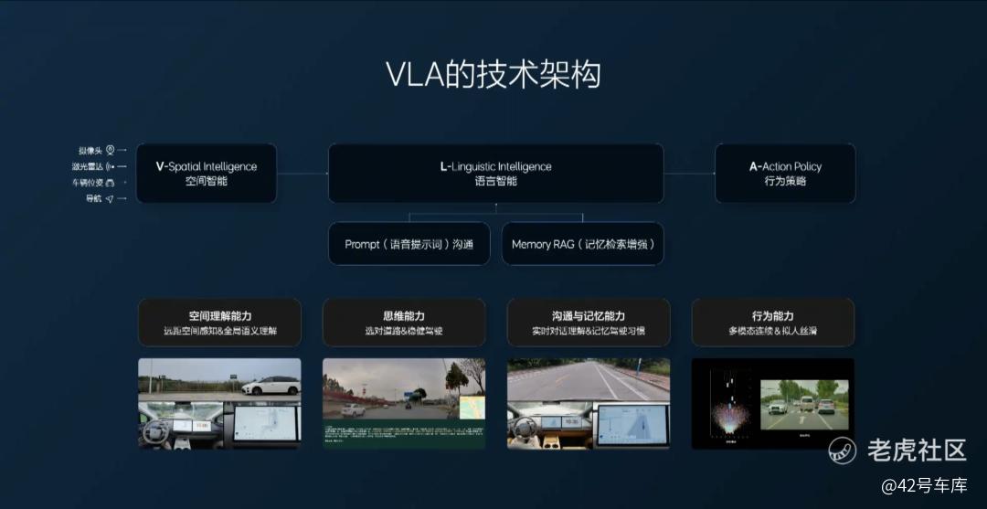 而 VLA 的核心能力可以总结为:能思考、能沟通、能记忆、能自我提升。基于这几个能力,产品上带给用户的实际体验是安全、舒适、高超的驾驶技巧和自然的交互能力。在 i8 这款产品上,VLA 的能力提升带来了整个产品体验的升级。