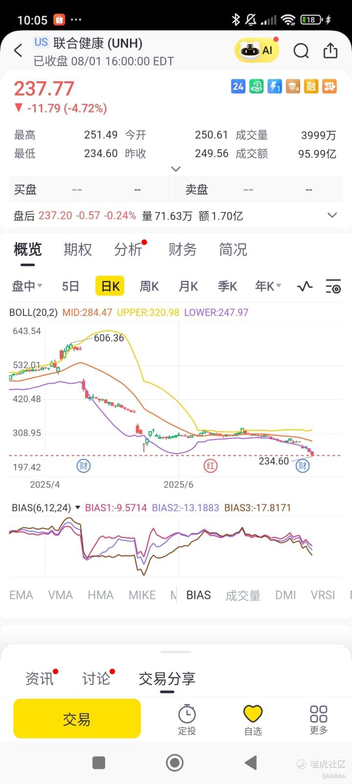 联合健康集团UnitedHealth Group2025年第二季度财报喜忧参半, $联合健康(UNH)$ 股票这几天也是跌到一个这几年以来的最低谷,有心想要抄底的朋友,都有点怕怕的,生怕自己抄底不成,反而被吊在半空中,卡的不上不下的难受。