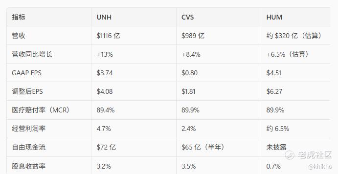 如果我们把 $联合健康(UNH)$ 和他的主要对手们 $西维斯健康(CVS)$ 以及 $哈门那(HUM)$ 做一个比较,其实UNH还是比较能打的那一个,规模最大,营收与现金流最强,Optum Insight利润率高达20.7%,为未来增长引擎。