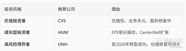如果单单从这个领域的3大玩家来看,根据各人的投资风格,可以选择不一样的标的,毕竟对于长期投资者而言,当前的UNH是一个高风险、高回报的博弈窗口。关键在于: