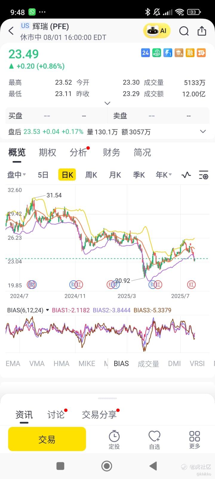 根据期权市场隐含波动率和历史财报反应,股价变动超过3.35%的概率为50%。但考虑到Pfizer的低Beta(0.34)和稳定性,股价维持在$23以上的概率约为60%-70%。