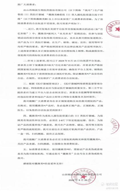 该声明称,锦波生物核心产品薇旖美(重组Ⅲ型人源化胶原蛋白冻干纤维)被纳入美团“百亿补贴”促销活动,但部分参与活动的商家所售薇旖美未获得锦波生物授权认证,也非从其授权渠道购入。
