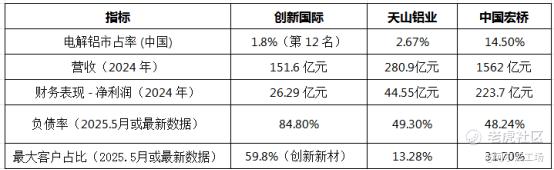 劣势:整体市占率较低。CRU数据显示,按2024年产量计,创新国际为中国第十二大电解铝生产商,仅占据约1.8%的市场份额。2024年,前五大电解铝生产商合共生产约2000万吨,占据约46%的中国电解铝总市场份额。