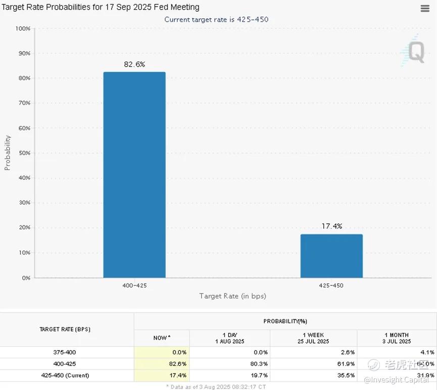 美国7月非农就业数据显著不及预期,新增就业仅7.3万人,创下去年10月以来最小增幅,且失业率从4.1%回升至4.2%。同时,5月和6月数据累计下修25.8万人,远超历史修正幅度。这一疲软报告直接强化了市场对美联储年内降息的预期:交易员将9月降息25个基点的概率从数据公布前的不到40%大幅上调至80%以上,并完全定价年底前两次降息的情景。