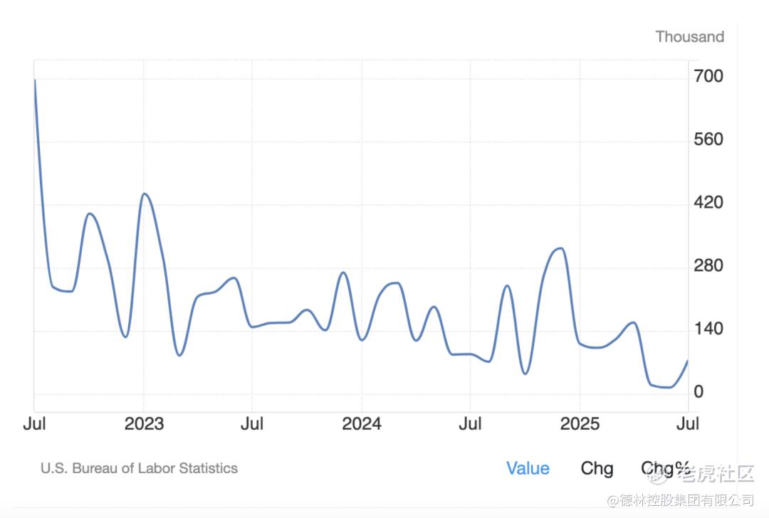 8月1日美国劳工统计局调整了5月和6月的就业数据,其中5月非农新增就业人数从14.4万修正为1.9万;6月从14.7万修正为1.4万。让5月和6月的新增就业减少了25.8万。特朗普对这个数据大为震怒,他指控劳工统计局长埃里卡·麦克恩塔弗曾经操纵就业数据帮助哈里斯助选,并宣布立即将其解雇。这样的就业数据已经不是“疲弱”二字可以概括,而是急速刹车,当日道指暴跌超500点,纳指重挫逾2%,国债收益率同步跳水。