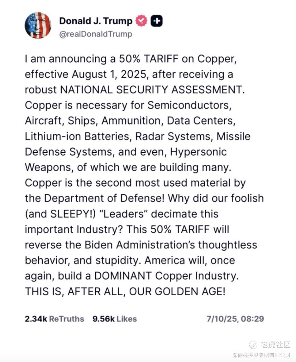 特朗普7月9日宣布,将从8月1日起对所有进口到美国的铜征收50%的关税,因为铜是众多技术领域的一种关键金属。他认为通过关税可以重建美国铜业的统治地位。