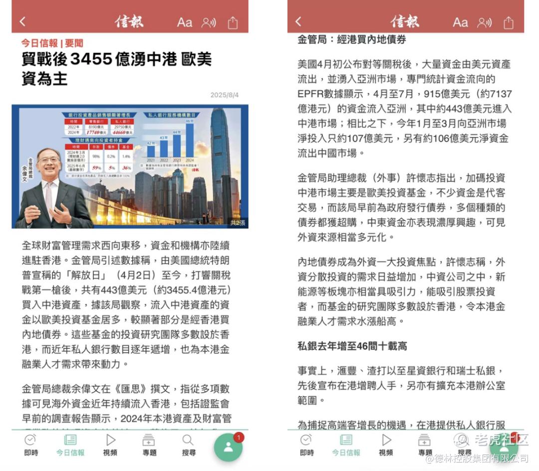 8月1日,香港稳定币法案已经开始实施,未来现实世界资产代币化(RWA)的趋势必定势不可挡。香港金管局统计,自从特朗普4月2日打响关税战至今,已经有3455亿港元的欧美资本涌入香港,买入内地、香港资产,其中主要是欧美的基金,Money Talks!