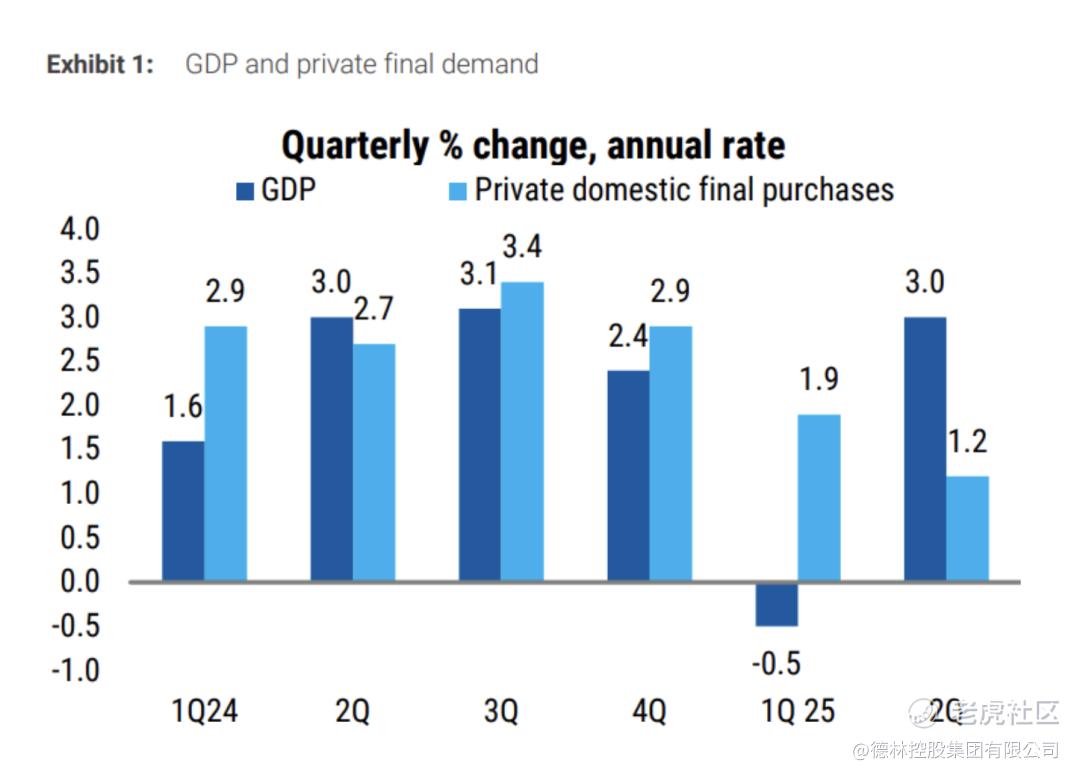 美国真实的经济情况如何呢?我们还要看消费。第二季度最终国内消费增长1.1%,低于第一季度的1.5%,远远小于2024年下半年3.4%和上半年2.8%。