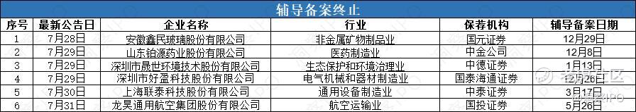 7月28日-8月3日,有6家公司境内(沪深两市)发行上市辅导备案终止。