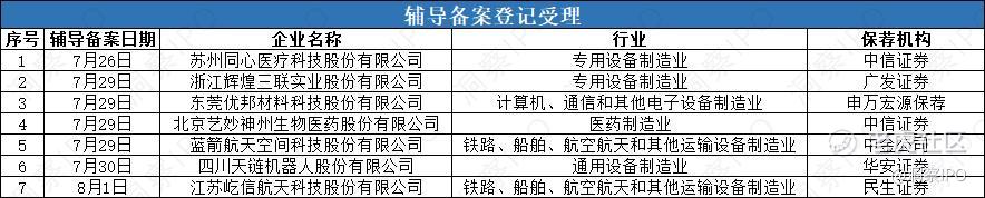 7月26日-8月3日,有7家公司境内(沪深两市)发行上市辅导备案登记获受理。