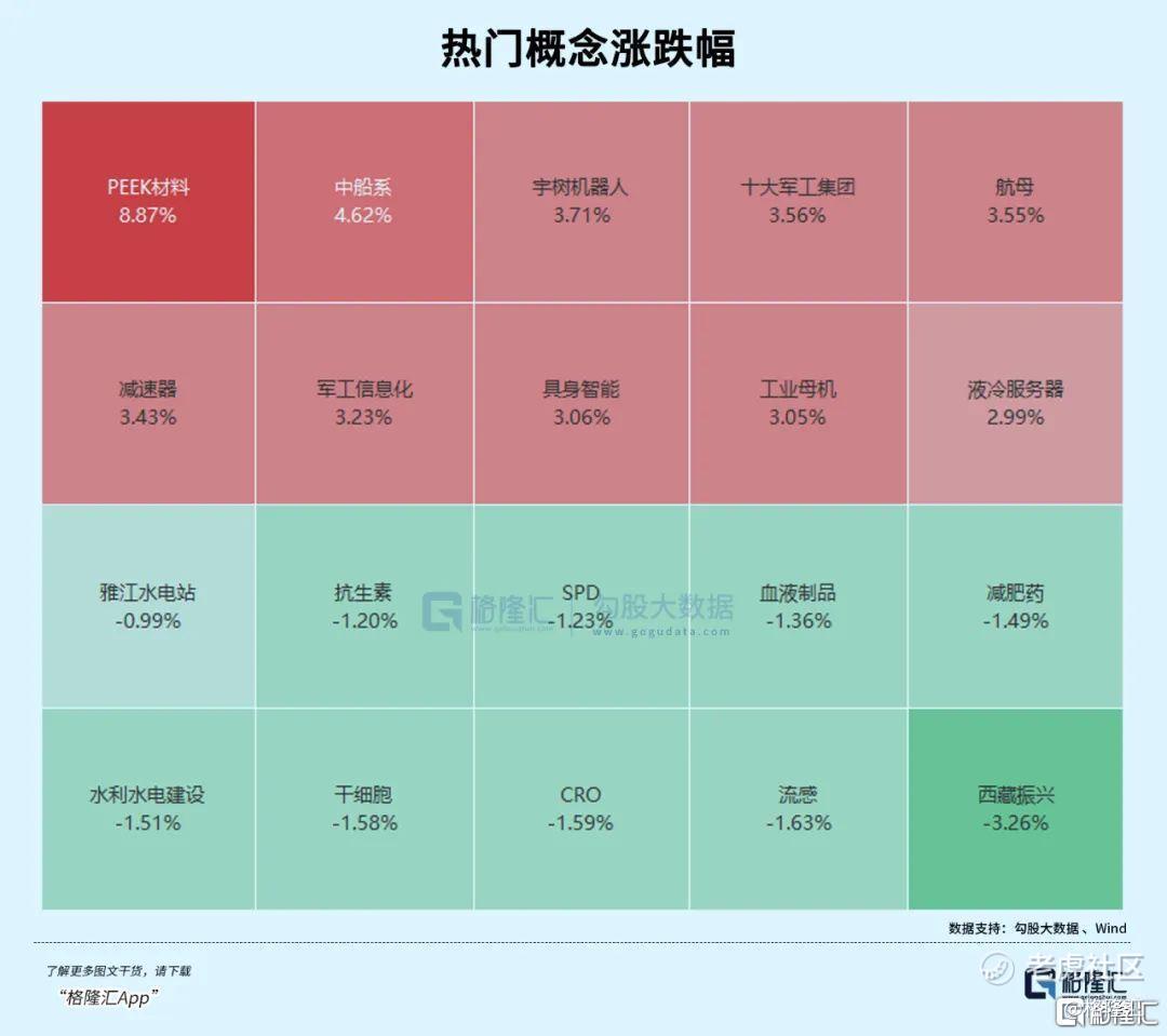 板块题材方面,硬件装备细分赛道一齐开花。Peek材料、液冷服务器、军工装备、人形机器人板块走高,水电、医药板块调整。