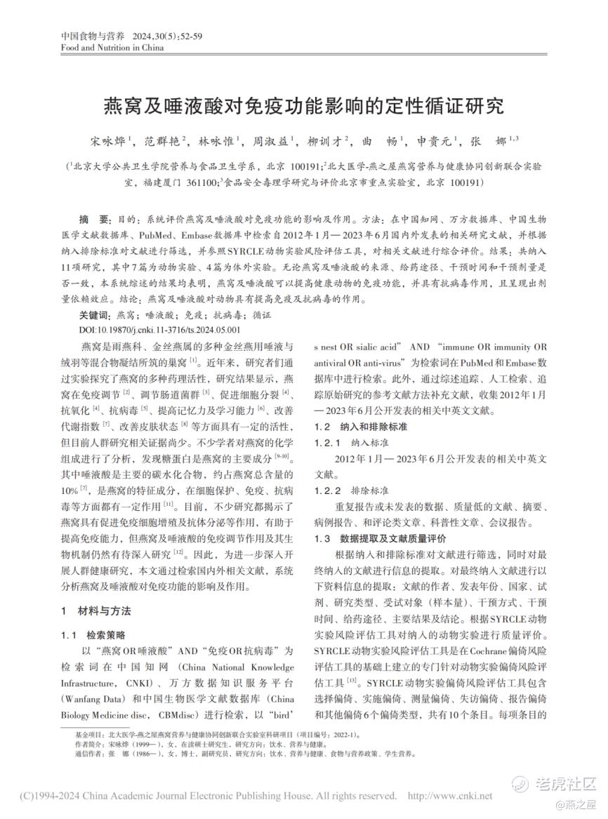 ③燕窝及唾液酸对免疫功能影响的定性循证研究[J].中国食物与营养,2024,30(05):52-59.DOI:10.19870/j.cnki.11-3716/ts.2024.05.001.