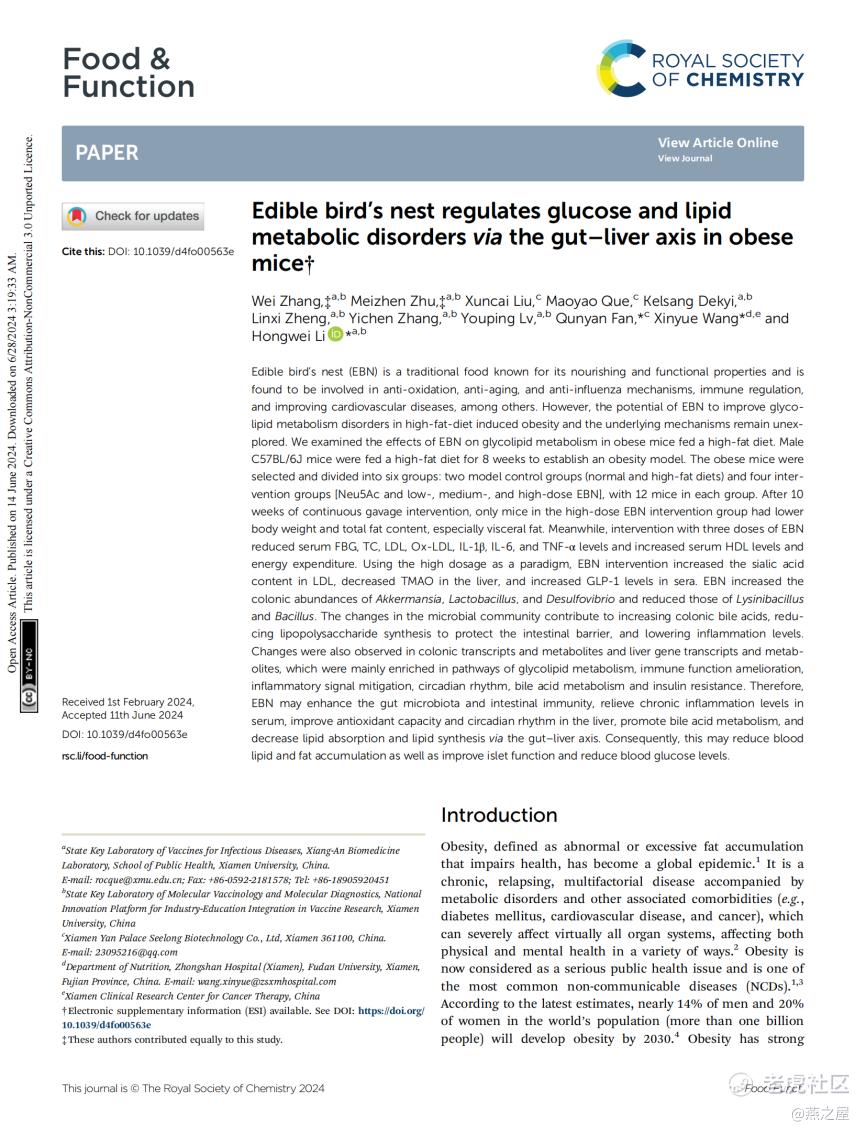 研究论文“Edible bird's nest regulates glucose and lipid metabolic disorders via the gut–liver axis in obese mice (食用燕窝通过肠-肝轴调节肥胖小鼠的糖脂代谢紊乱)”④