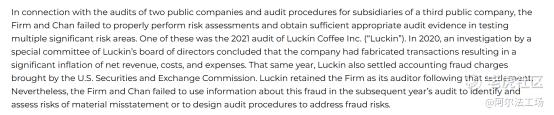 PCAOB的调查结果显示,中正达在对瑞幸2021年的财报审计中,未能利用有关公司虚假会计的信息进行风险评估,也未能设计旨在避免欺诈的审计程序。