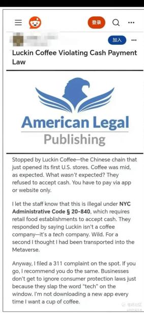 开业之时,有海外网友反映,瑞幸纽约门店拒绝接受现金,仅支持官方APP或网站下单。此举直接触碰了法规红线。