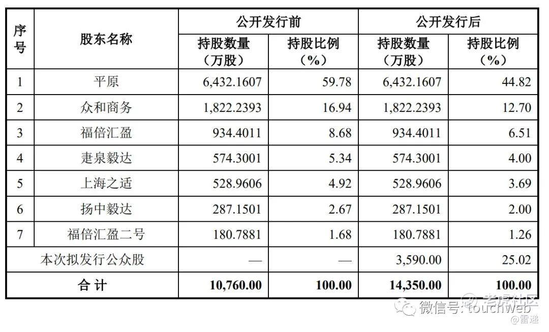 IPO后,平原持股为44.82%,众和商务持股为12.7%,福倍汇盈持股为6.51%,疌泉毅达持股为4%,上海之适持股为3.69%,扬中毅达持股为2%,福倍汇盈二号持股为1.26%。