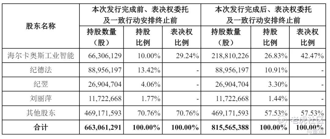 通过本次协议转让、本次表决权委托及本次一致行动安排,海尔卡奥斯工业智能取得上市公司66,306,129股股份(占上市公司总股本的10.00%)及127,583,569股股份(占上市公司总股本的19.24%)所对应的表决权,合计控制上市公司193,889,698股股份(占上市公司总股本的29.24%)所对应的表决权。上述期限内,纪德法、刘丽萍、纪翌与海尔卡奥斯工业智能保持一致行动关系。