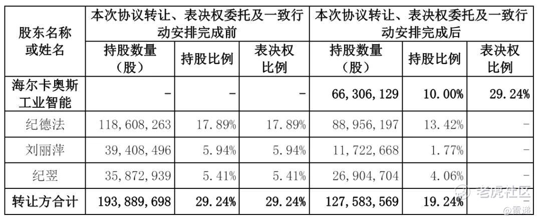 2025年2月14日,海尔卡奥斯工业智能与纪德法、刘丽萍、纪翌签署《股份转让协议》,约定纪德法将其持有的上市公司无限售流通股29,652,066股(占上市公司股份总数的4.47%)依法转让给海尔卡奥斯工业智能;