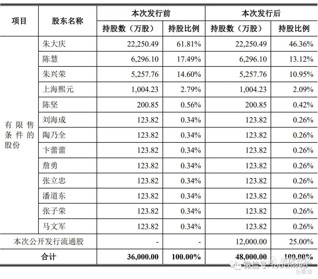 IPO前,朱大庆持有公司61.81%股份,为公司控股股东。陈慧持有公司17.49%股份,朱大庆、陈慧夫妇合计持有公司79.3%股权,为实控人。