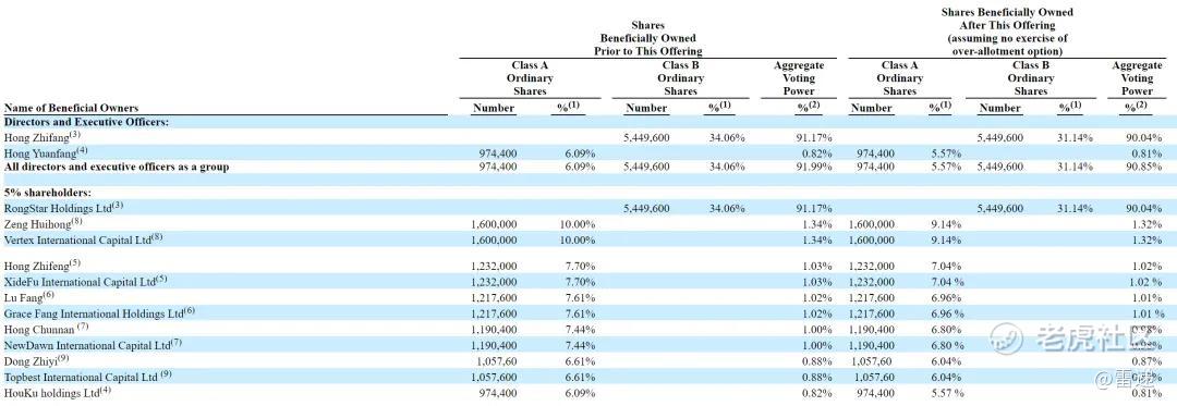 IPO后,Hong Zhifang持有31.14%的B类股,有90.04%的投票权;Hong Yuanfang持有6.09%的A类股,有5.57%的投票权。Zeng Huihong持有9.14%的A类股,有1.32%的投票权。