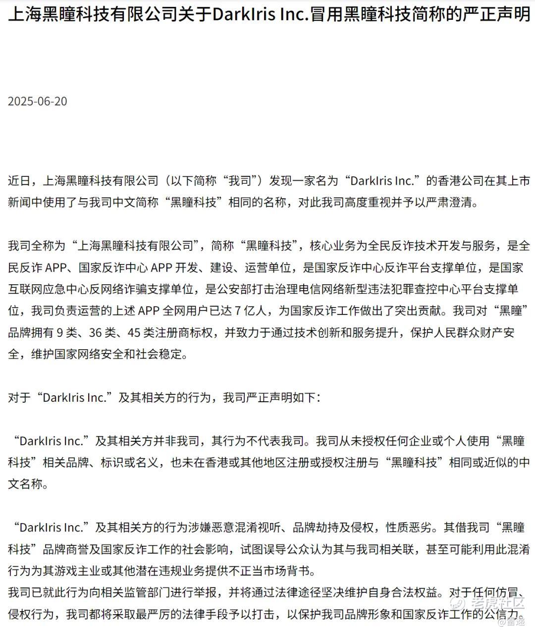上海黑瞳科技认为,“DarkIris Inc.”及其相关方的行为涉嫌恶意混淆视听、品牌劫持及侵权,性质恶劣。公司已就此行为向相关监管部门进行举报,并将通过法律途径坚决维护自身合法权益。