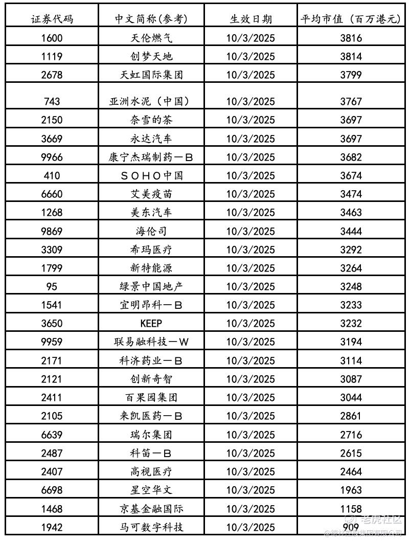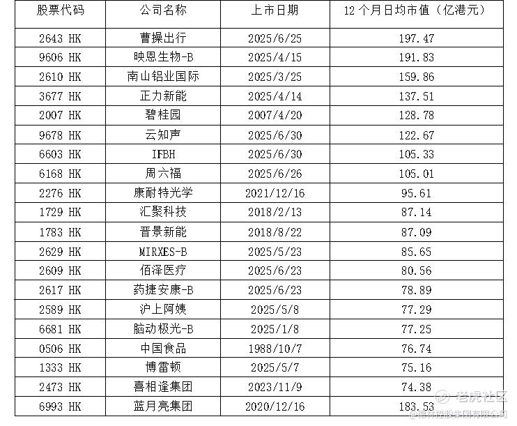 因市值不足调出港股通的时间为每年 2月底(考察上一年1月1日至上一年12月31日数据)、8月底(考察上一年7月1日至本年6月30日数据)。2025年2月,因市值不足而被剔出恒生综指、进而被调出港股通的公司日均市值门槛为39.3亿港币。