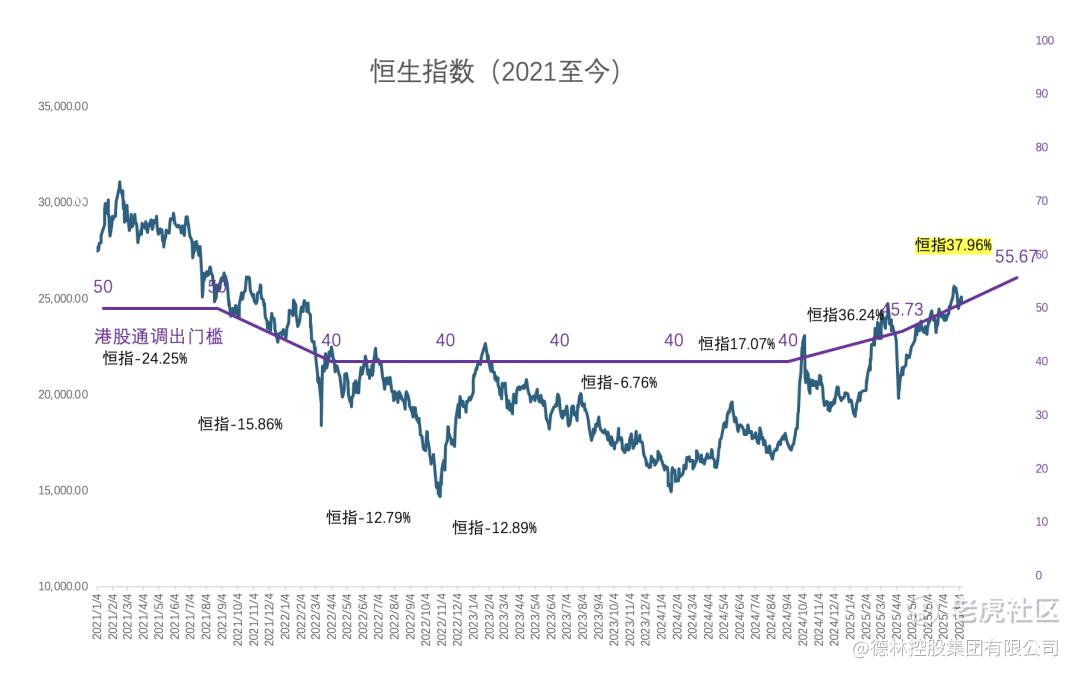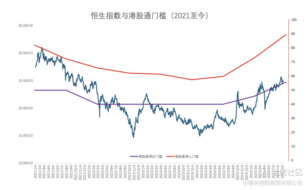 我认为当下最值得关注的是出通门槛。一开始港股通设置了50亿港币市值的调出门槛,当时主要是为了保护投资者,即便这些小市值股票在恒生综合指数内也要被强制踢出,因为市场持续下滑,2022年底港股通的调出门槛下调到了40亿港币。现在随着港股回升,调出港股通的门槛仍然是40亿港币,但是恒生综合指数的门槛水涨船高,2025年8月这次调整可能将上升到45.7亿,低于这个市值的公司将被剔出恒生综合指数。
