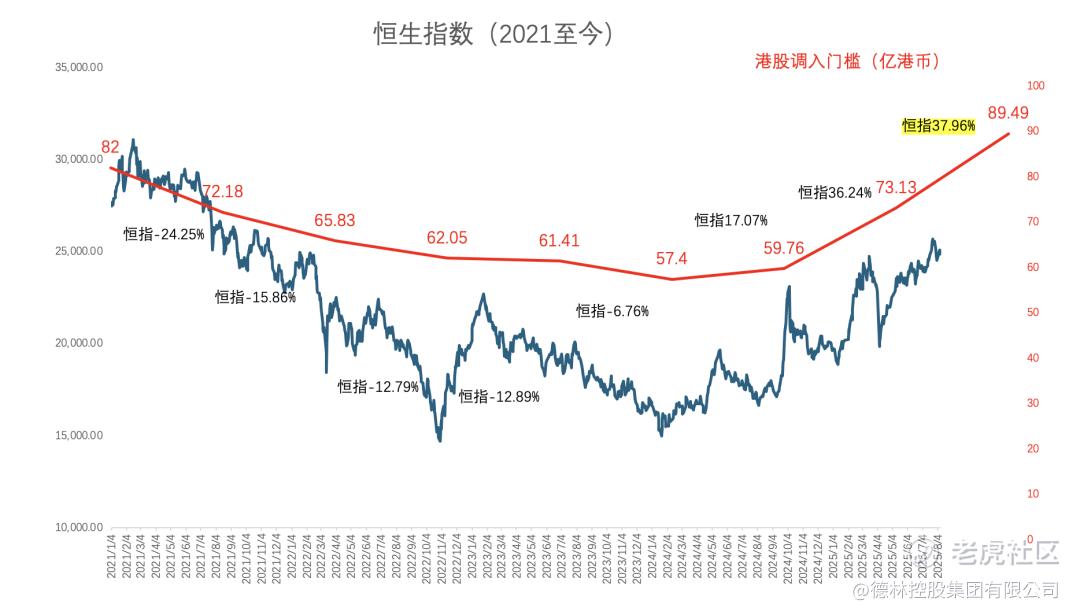 下表标出了港股通调入门槛调整前一年的恒指涨跌幅。港股通门槛从2021年的82亿港币下滑到2024年的57.4亿港币,同时期恒指下跌了27%。但这一趋势已经随着恒指的上涨而发生了逆转。恒指已经从2024年初的15500点上涨到现在的25000点,涨幅高达60%。2025年8月即将公布的港股通入通门槛也将提升到73亿港币,2026年2月可能会提升到89亿港币。
