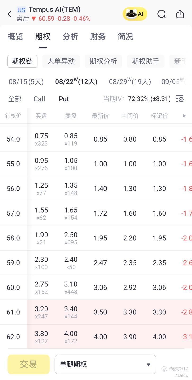 结合Tempus AI(TEM)最新财报表现与期权链数据,以下是一个胜算较高、风险可控的期权策略,我想要使用于下周(8月16日)前到期的短期操作: