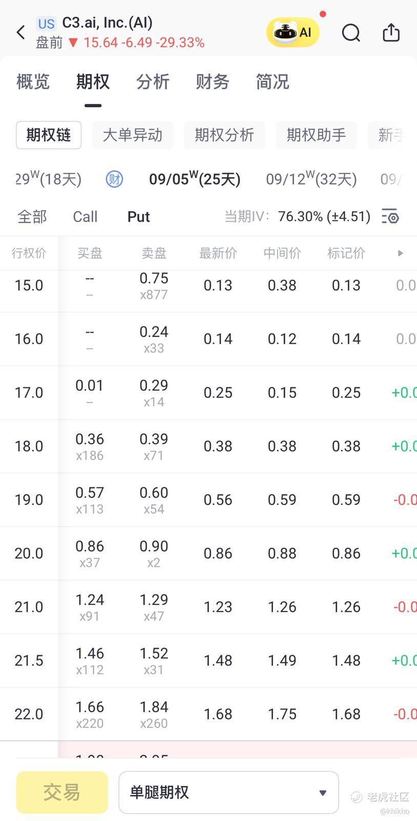 我有点心痒痒,想做一个现金担保卖Put(Cash-Secured Put),我打算选择执行价$15 的Put,略低于关键支撑位 $15.71,到期日打算选9月6日,若股价维持在 $15 以上,赚取权利金;若跌破则以折价买入。期权链还没更新,应该是要开盘才会更新,看样子IV不会低。[财迷]