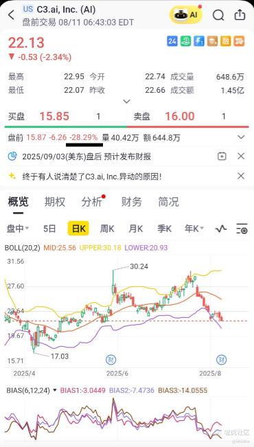 $C3.ai, Inc.(AI)$ 盘前大跌28%多,目前价格15.85就可以买到一股,吓人哦。这次的大跌,主要原因应该是他们公司在上周五盘后发布的那份2026财年第一季度的初步业绩,远低于市场预期,希望越大,失望越大,高高举起,重重的砸下,就变成今天这样了。